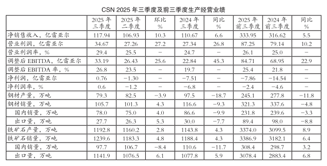 2025年三季度,受钢材发货量环比增加、同比减少,巴西国内钢材销售价格同环比下跌,巴西雷亚尔兑美元汇率环比升值,铁矿石销量同环比增长以及铁矿石价格环比小幅上涨等因素共同影响,CSN净销售收入由二季度的106.93亿雷亚尔环比大幅增长10.3%至117.94亿雷亚尔,与2024年三季度的110.67亿雷亚尔相比也增加6.6%;营业利润由二季度的27.26亿雷亚尔环比显著增长27.2%至34.67亿雷亚尔,与2024年三季度的27.34亿雷亚尔相比也显著提升26.8%;受钢铁部门、能源部门营业利润率下降,矿业部门、水泥部门和物流部门营业利润率提高等因素共同影响,CSN营业利润率由二季度的25.5%回升至29.4%,且高于2024年三季度的24.7%;调整后EBITDA由二季度的26.43亿雷亚尔环比显著提高25.6%至33.19亿雷亚尔,与2024年三季度的22.84亿雷亚尔相比也显著增长45.3%;调整后EBITDA率由二季度的23.5%环比提升至26.8%,且远高于2024年三季度的19.7%;吨钢EBITDA由二季度的574雷亚尔环比显著下滑29.4%至405雷亚尔,与2024年三季度的333雷亚尔相比则显著提升21.6%;净利润扭亏为盈,由二季度的亏损1.30亿雷亚转为盈利0.76亿雷亚尔,2024年三季度的净利润为亏损7.51亿雷亚尔;净利润率由二季度的-1.2%显著提升至0.6%,且远高于2024年三季度的-6.8%。