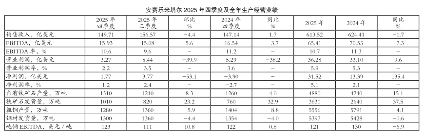 2025年四季度,安赛乐米塔尔公司钢材发货量环比小幅减少4.4%,北美部门、巴西部门和欧洲部门钢材平均销售价格均环比下跌,铁矿石发货量环比显著增长23.2%,国际市场铁矿石参考价格环比小幅上涨3.5%。受上述因素共同影响,安赛乐米塔尔2025年四季度销售收入由三季度的156.57亿美元环比小幅减少4.4%至149.71亿美元,与2024年四季度的147.14亿美元相比则小幅增加1.7%;受北美部门和欧洲部门盈利水平下滑、巴西部门和矿业部门盈利水平提升,印度部门及其合资企业盈利改善等因素共同影响,息税、折旧及摊销前利润(EBITDA)由三季度的15.08亿美元环比小幅提高5.6%至15.93亿美元,与2024年四季度的16.54亿美元相比则小幅回落3.7%;EBITDA率由三季度的9.6%环比提升至10.6%,但仍低于2024年四季度的11.2%;营业利润由三季度的5.44亿美元环比显著下滑39.9%至3.27亿美元,与2024年四季度的5.29亿美元相比也显著下降38.2%;营业利润率由三季度的3.5%显著回落至2.2%,且低于2024年四季度的营业利润率(3.6%);受营业利润下滑以及汇兑损失增加等因素影响,净利润由三季度的3.77亿美元环比显著缩水53.1%至1.77亿美元,2024年四季度的净利润为亏损3.90亿美元;净利润率由三季度的2.4%显著下降至1.2%,但远高于2024年四季度的-2.7%。