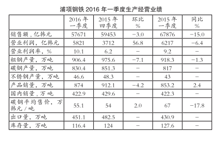 韩国浦项集团公布的一季度财报显示,在钢材产量和销量下滑、销售额减少的情况下,浦项钢铁经营业绩大幅改善。一季度浦项钢铁销售额为57671亿韩元,环比减少3.0%;但营业利润为5821亿韩元,环比猛增56.8%;营业利润率达10.1%,环比提高3.9个百分点。