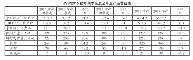 受粗钢产量增长、钢材发货量增加以及高附加值钢材销售占比提高等因素影响,第四财季JSW营业收入环比增长21.3%至1159.7亿卢比,但同比依然下滑14.3%;受益于印度限制钢材最低进口价格以及炼焦煤成本下降,JSW第四财季EBITDA环比激增104.6%至182.5亿卢比,同比增幅为8.4%;净利润也实现扭亏为盈,由第三财季的亏损92.3亿卢比转为盈利17.1亿卢比,且比2014财年四季度增长175.8%。