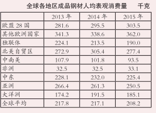 世界钢铁协会日前发布的年度统计数据显示,2015年全球人均成品钢材表观消费量连续第二年出现下滑,降至208.2千克,较上年的217.1千克减少4.1%,并且较2013年的217.8千克下降4.4%,但仍高于2012年水平。
