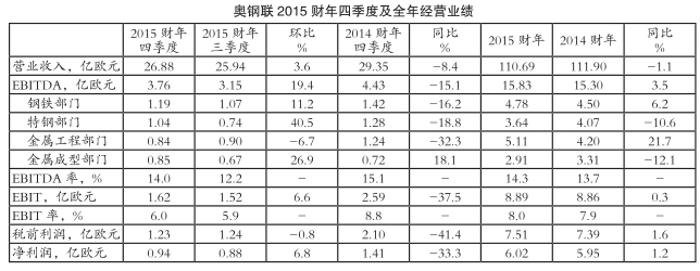 面对严峻的市场形势,奥地利奥钢联集团继续专注于高技术含量、高附加值钢材市场,从而实现了经营业绩的稳步增长。2015财年四季度,受益于欧洲钢材需求适度复苏和价格回升,以欧洲为主要市场的奥钢联集团经营业绩环比改善。第四财季,奥钢联集团实现营业收入26.88亿欧元,与第三财季的25.94亿欧元相比小幅增长3.6%,但同比依然下滑8.4%;息税、折旧及摊销前利润(EBITDA)为3.76亿欧元,环比大幅增长19.4%,同比降幅为15.1%;EBITDA率由第三财季的12.2%升至14.0%,但依然低于2014财年四季度的15.1%;息税前利润(EBIT)为1.62亿欧元,环比小幅增长6.6%,同比降幅却高达37.5%;EBIT率由第三财季的5.9%小幅增加至6.0%,但仍低于2014财年四季度的8.8%;税前利润为1.23亿欧元,环比基本持平,同比显著下降41.4%;净利润为0.94亿欧元,环比小幅增长6.8%,同比降幅达33.3%。