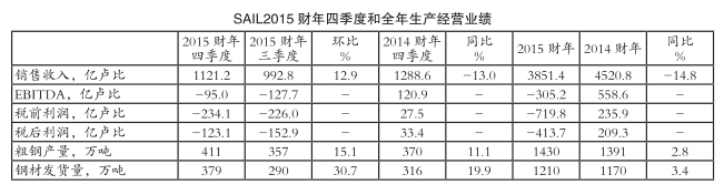 从2015财年全年来看,SAIL虽然粗钢产量同比增长2.8%至1430万吨,钢材发货量同比增加3.4%至1210万吨,但受钢材销售均价下滑影响,销售收入同比减少14.8%至3851.4亿卢比;EBITDA由2014财年的盈利558.6亿卢比转为亏损305.2亿卢比;税前利润由2014财年的盈利235.9亿卢比转为巨幅亏损719.8亿卢比;税后利润也由2014财年的盈利209.3亿卢比转为亏损413.7亿卢比。