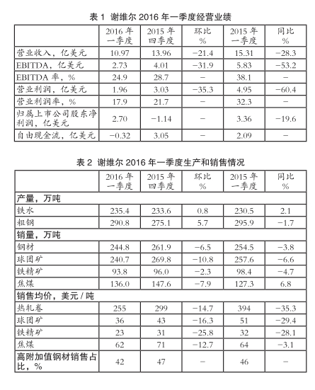2016年一季度依然是俄罗斯国内市场传统钢材消费淡季,该国钢材需求再度下滑。谢维尔公司一季度铁水产量环比维持基本稳定,仅微增0.8%至235万吨,同比增幅也仅为2.1%。受益于切列波韦茨钢厂(Cherepovets)1号转炉、4号和5号连铸机以及小方坯连铸机完成检修后恢复生产,以及巴拉科沃(Bal akovo)短流程钢厂产能利用率提高,谢维尔一季度粗钢产量环比增长5.7%至291万吨,但同比依然小幅下降1.7%。由于传统淡季俄罗斯国内钢材消费量进一步萎缩,谢维尔一季度钢材销量环比进一步减少6.5%至245万吨,同比降幅为3.8%;其中,国内销量占比由去年四季度的64%降至60%。受切列波韦茨钢厂4机架冷轧机1月开始升级改造影响,谢维尔一季度高附加值钢材产量下降,高附加值钢材销售占比也由去年四季度的47%降至42%。