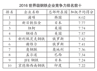 作为全球最具竞争力钢企,浦项在技术创新能力、技术工人熟练程度、联盟与合资、所在国家风险等方面获得10分的满分,但在获取铁矿石和炼焦煤等炼钢原料、能源成本、国内市场趋于饱和、来自邻近竞争对手威胁等方面存在短板,得分相对较低,该公司以加权平均得分8.02分继续高居榜首,较上年得分(7.91分)有明显提升,但与第二名(新日铁住金公司7.77分)之间的差距有所缩小。