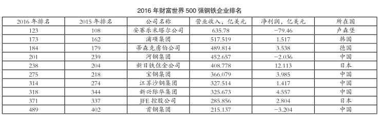7月20日,《财富》杂志公布了2016年世界500强排行榜。该排行榜按照截止日期不晚于2016年3月31日的财政年度营业收入对公司进行排名。今年全球共有十家钢铁企业入围,相比上年减少三家,均为中国钢铁企业,分别是渤海钢铁集团、鞍钢集团和武钢集团。