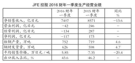 2016财年一季度(2016年4-6月),全球经济虽适度复苏,但新兴市场国家经济依然不景气,此外英国脱欧也增加了欧盟经济前景的不确定性。在这样的经济大背景下,国际市场钢材需求和价格小幅回升,又推动全球粗钢产能利用率增长,市场供需状况仍难言乐观。在日本国内,私人消费和企业资本投资放缓导致该国经济陷入停滞,同时日元兑美元升值又抑制该国产品出口。受以上因素影响,第一财季JFE控股公司虽然粗钢产量和钢材发货量环比增长,但钢材平均销售价格大幅下跌,净销售收入下滑,营业利润、经常利润和净利润均陷入亏损。