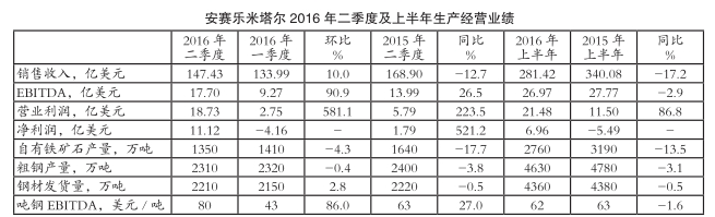 安赛乐米塔尔公司董事长拉克希米·米塔尔表示,2016年二季度公司生产经营业绩持续改善,这主要受益于主要产品市场钢材价格回升,包括矿业部门在内的各个下属部门销售额和EBITDA均实现增长。与此同时,安赛乐米塔尔通过增发股份,出售Gestamp公司资产以及削减债务水平,进一步强化公司的资产负债表。与2015年下半年相比,尽管全球钢铁行业依然面临结构性产能过剩,但市场供需状况及钢材价格出现适度好转,因此安赛乐米塔尔对下半年业绩持谨慎乐观态度。拉克希米·米塔尔强调,未来五年将继续按照“2020年行动计划”(Action 2020)对公司业务结构进行战略性调整,提高盈利能力,使公司EBITDA和现金流在长期内实现可持续增长。