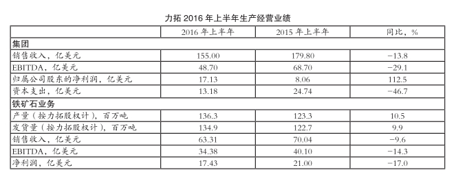 力拓集团2016年上半年销售收入为155.00亿美元,较2015年上半年的179.80亿美元下滑13.8%;息税、折旧及摊销前利润(EBITDA)为48.70亿美元,同比显著下降29.1%;EBITDA率由2015年上半年的38%降至33%;归属公司股东的净利润由2015年上半年的8.06亿美元激增112.5%至17.13亿美元。净利润增长主要是由于力拓出售资产收益2亿美元,外汇及衍生品非现金收益6亿美元以及有偿合同收益5亿美元。