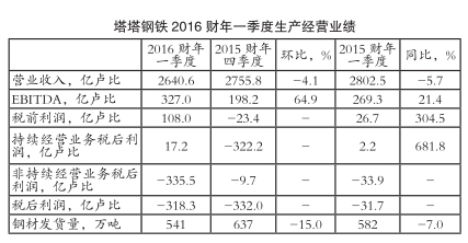 受钢材发货量下降拖累,虽然塔塔钢铁钢材销售均价小幅回升,但其第一财季营业收入仍环比减少4.1%至2640.6亿卢比,同比降幅为5.7%。第一财季,国际市场炼钢原料价格跟随成品钢材价格上涨,导致塔塔钢铁炼钢原料成本由2015财年四季度的636.3亿卢比增加至692.3亿卢比,但低于2015财年同期的776.4亿卢比。由于塔塔钢铁旗下印度部门、欧洲部门和东南亚部门经营业绩改善,第一财季塔塔钢铁息税、折旧及摊销前利润(EBITDA)环比和同比分别大幅增长64.9%和21.4%至327亿卢比; EBITDA率由2015财年四季度的7.2%上升至12.4%,且高于2015财年同期的9.6%;税前利润实现扭亏为盈,由2015财年四季度的亏损23.4亿卢比转为盈利108亿卢比,比2015财年一季度的税前利润(26.7亿卢比)增长304.5%;剔除欧洲长材业务后的持续经营业务税后利润也实现扭亏为盈,由2015财年四季度的亏损322.2亿卢比转为盈利17.2亿卢比,比2015财年一季度的税后利润(2.2亿卢比)激增681.8%;但受欧洲长材业务亏损拖累,塔塔钢铁含欧洲长材业务在内的非持续经营业务税后利润持续亏损,亏损额由2015财年四季度的9.7亿卢比大幅增加至335.5亿卢比,2015财年一季度的税后利润为亏损33.9亿卢比;持续经营业务税后利润与非持续经营业务税后利润相抵之后,税后利润为亏损318.3亿卢比,2015财年四季度及一季度的税后利润亏损额则分别为332.0亿卢比和31.7亿卢比。