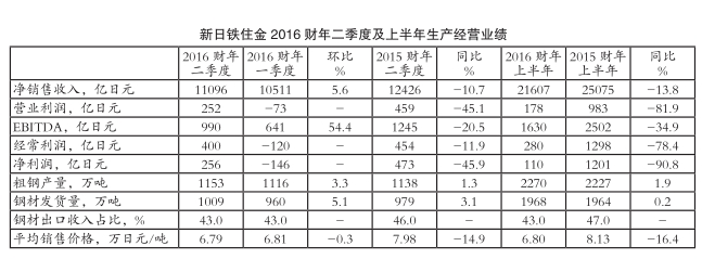 受益于钢材发货量增长以及平均销售价格维持相对稳定,第二财季新日铁住金公司实现净销售收入11096亿日元,环比增长5.6%,但同比依然下滑10.7%;营业利润实现扭亏为盈,由第一财季的亏损73亿日元转为盈利252亿日元,但仍低于2015财年同期的盈利额(459亿日元),同比降幅高达45.1%;息税、折旧及摊销前利润(EBITDA)为990亿日元,环比显著增长54.4%,同比则依然下滑20.5%;经常利润同样实现扭亏,由第一财季的亏损120亿日元转为盈利400亿日元,而2015财年同期盈利额为454亿日元,同比降幅为11.9%;净利润也由第一财季的亏损146亿日元转为盈利256亿日元,2015财年同期盈利473亿日元,同比降幅高达45.9%。