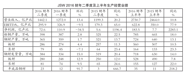 鉴于上半财年粗钢产量和钢材发货量均实现增长,JSW预计2016财年产销量目标能够实现。2016财年JSW钢材产销量目标为:粗钢产量同比增长25%至1575万吨,钢材发货量同比增长24%至1500万吨。