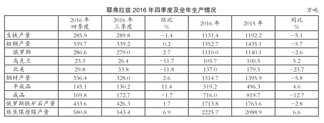 2016年,耶弗拉兹生铁平均销售价格由2015年的180美元/吨下跌至167美元/吨,半成品钢材平均销售价格由2015年的256美元/吨微降至254美元/吨,建筑用钢平均销售价格由2015年的383美元/吨小幅上涨至392美元/吨,钢轨平均销售价格由2015年的540美元/吨下跌至489美元/吨。
