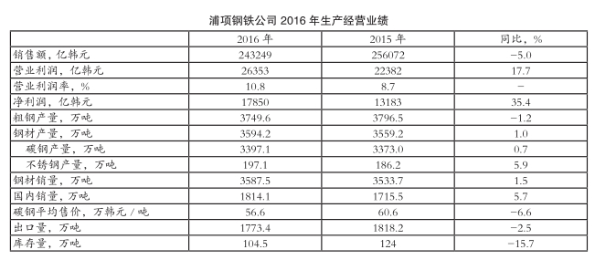 韩国浦项近日公布的2016年财报显示,其2016年粗钢产量同比小幅下滑,钢材产量和销量却双双实现同比小幅增长。受碳钢平均销售价格由2015年的60.6万韩元/吨同比下跌6.6%至56.6万韩元/吨影响,浦项钢铁销售额同比下滑5.0%至24.32万亿韩元;但通过扩大高附加值WP(World Premium)产品销售(获得收益1万亿韩元)及降本增效(创效4000亿韩元),其营业利润同比大幅增长17.7%至2.64万亿韩元;营业利润率达到10.8%,同比增长2.1个百分点,这是自2011年以来营业利润率首次达到两位数;净利润为1.79万亿韩元,同比显著增长35.4%;负债率降至17.4%,为公司创立以来的最低水平。