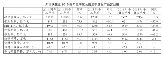 2016财年三季度(2016年10-12月),全球经济适度复苏,美国经济稳步增长,欧洲经济继续小幅回升,中国经济受刺激政策拉动持续向好。与此同时,日本国内企业产品产量增长、劳动力就业状况改善以及其他经济指标显示,该国经济出现早期复苏迹象。从钢材市场来看,在传统消费淡季北美和东南亚市场钢材需求维持相对稳定,市场供需状况适度改善的同时,焦煤和焦炭成本增加支撑钢材价格持续上涨;日本国内钢材需求受汽车业和建筑业拉动,恢复到2015财年水平。