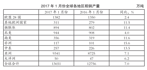 世界钢铁协会2月21日发布的最新统计数据显示,2017年1月份全球67个主要产钢国家和地区粗钢产量为1.365亿吨,同比增长7.0%,自2016年6月份恢复增长以来已连续八个月保持同比增加,并且增速创反弹以来新高,中国、印度和俄罗斯等国家是主要推动力量。分地区来看,全球所有产钢地区粗钢产量均保持增长,其中独联体、南美、其他欧洲国家、中东和非洲钢产量同比增速均达到两位数。