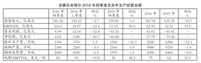 安赛乐米塔尔公司2016年四季度业绩报告显示,受北半球钢材市场传统需求淡季影响,其粗钢产量和钢材发货量环比小幅下滑。由于铁矿石发货量增加及售价上涨部分弥补了钢材发货量减少和平均销售价格下跌的影响,安赛乐米塔尔四季度销售收入仅环比小幅下滑2.7%至141.26亿美元,同比则小幅增长1.0%;息税、折旧及摊销前利润(EBITDA)从三季度的18.97亿美元大幅下滑12.4%至16.61亿美元,但同比增幅高达50.6%;受旗下钢铁部门业绩下滑影响,营业利润从三季度的12.04亿美元显著减少32.8%至8.09亿美元,2015年四季度营业利润为亏损53.31亿美元;净利润从三季度的6.80亿美元显著下降40.7%至4.03亿美元,2015年四季度净利润为亏损66.86亿美元。