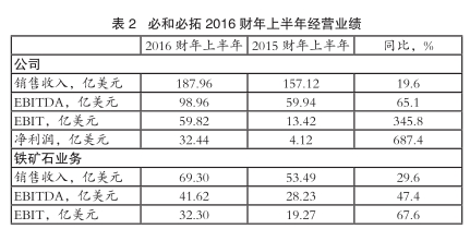 必和必拓铁矿石部门2016财年上半年也受益于铁矿石开采量、发货量增加以及铁矿石平均销售价格上涨,销售收入同比显著增长29.6%至69.30亿美元;EBITDA同比显著增加47.4%至41.62亿美元;EBIT同比激增67.6%至32.30亿美元。