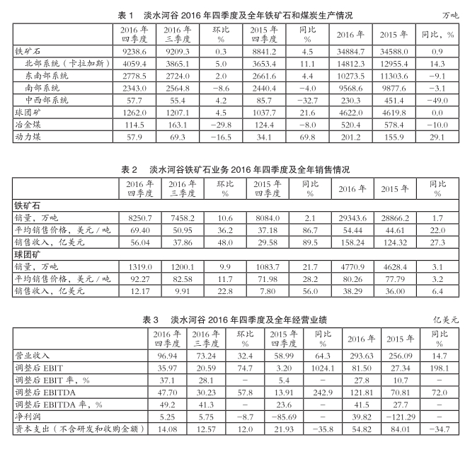 四季度,淡水河谷公司铁矿石粉矿销量为8251万吨,环比和同比分别增长10.6%和2.1%;粉矿平均销售价格由2016年三季度的50.95美元/吨显著上涨36.2%至69.40美元/吨,同比涨幅更是高达86.7%,这使其粉矿销售收入环比显著增长48.0%至56.04亿美元,同比增幅高达89.5%。同期,淡水河谷公司球团矿销量为1319万吨,环比增长9.9%,同比显著增长21.7%,球团矿平均销售价格由2016年三季度的82.58美元/吨增长11.7%至92.27美元/吨,从而使其球团矿销售收入环比显著增长22.8%至12.17亿美元,同比激增56.0%。2016年,淡水河谷粉矿销量为2.93亿吨,同比小幅增长1.7%,粉矿平均销售价格由2015年的44.61美元/吨显著增长22.0%至54.44美元/吨,粉矿销售收入同比显著增加27.3%至158.24亿美元。同期,淡水河谷球团矿销量为4771万吨,同比小幅增长3.1%,球团矿平均销售价格由2015年的77.79美元/吨小幅上涨至80.26美元/吨,球团矿销售收入同比增长6.4%至38.29亿美元。