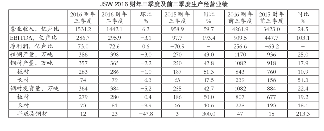受产品品种增加以及高附加值钢材销量提高等因素拉动,第三财季JSW营业收入环比和同比分别增长6.2%和59.7%至1531.2亿卢比;受炼钢原料成本增加影响,JSW第三财季息税、折旧及摊销前利润(EBITDA)环比小幅减少3.1%至286.7亿卢比,但同比激增193.4%;净利润由第二财季的72.6亿卢比微增0.6%至73.0亿卢比,2015财年同期净利润为亏损70.9亿卢比。