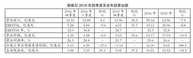 2016年全年,谢维尔公司铁水和粗钢产量同比小幅增长,但钢材销量同比小幅下滑1.4%至1067万吨,其中高附加值钢材销量占比降至42%。加之2016年谢维尔热轧卷和大口径钢管平均销售价格下滑,谢维尔营业收入同比下滑7.5%至59.16亿美元;EBITDA同比减少8.8%至19.11亿美元;EBITDA率由2015年的32.8%小幅下降至32.3%;营业利润同比下滑10.9%至15.17亿美元;营业利润率由2015年的26.6%降至25.6%;净利润则同比骤增188.3%至16.20亿美元。2016年,谢维尔资本支出额同比大幅增长19.3%至5.25亿美元。