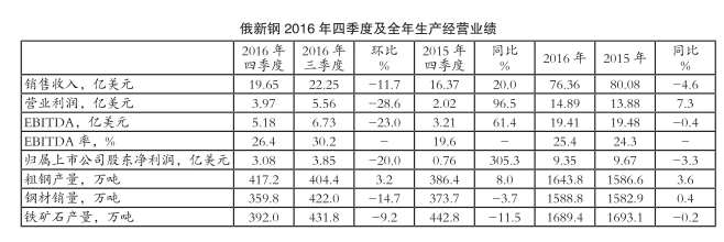 从2016年全年来看,俄新钢钢材发货量同比微增0.4%至1589万吨,但钢材销售均价出现下滑,因此其2016年销售收入同比小幅减少4.6%至76.36亿美元。其中,来自当地市场的收入占比为76%;来自外部市场的收入占比为24%。2016年,受益于生产效率提高以及单位能耗下降,俄新钢板坯现金成本进一步下降5%至194美元/吨。此外,受益于卢布兑美元汇率贬值10%,俄新钢产品销售成本减少8%至50.74亿美元,与此同时,俄新钢通过提高生产效率降低生产成本8200万美元。这些因素弥补了钢材销售均价下滑带来的负面影响,使俄新钢2016年营业利润同比增长7.3%至14.89亿美元;EBITDA却同比微降0.4%至19.41亿美元;EBITDA率由2015年的24.3%小幅提升至25.4%;净利润同比小幅下降3.3%至9.35亿美元。2016年,俄新钢资本支出额同比减少6.0%至5.59亿美元(含2.96亿美元维护检修费用)。俄新钢预计2017年资本支出总额约为7亿美元。相关资讯