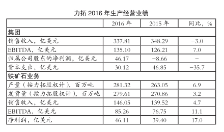 力拓集团2016年全年销售收入为337.81亿美元,较2015年的348.29亿美元下滑3.0%;受益于生产成本进一步下降,息税、折旧及摊销前利润(EBITDA)为135.10亿美元,同比增长7.0%;EBITDA率由2015年的34%增加至38%;归属公司股东的净利润实现扭亏为盈,由2015年的亏损8.66亿美元转为盈利46.17亿美元。净利润增长主要是由于力拓出售资产收益4亿美元,外汇及衍生品非现金收益5亿美元以及铁矿石和焦煤价格上涨。