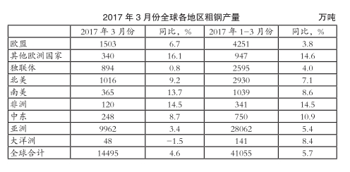 世界钢协公布的统计数据还显示,2017年1-3月份全球67个主要产钢国家和地区累计粗钢产量达到4.105亿吨,同比增长5.7%。其中:亚洲粗钢产量为2.806亿吨,同比增长5.4%,中国粗钢产量达到2.011亿吨,同比攀升4.6%,占全球总产量的比重为49.0%;欧盟粗钢产量为4251万吨,同比增长3.8%;北美粗钢产量为2930万吨,同比攀升7.1%;独联体粗钢产量2595万吨,同比增幅为4.0%;南美粗钢产量1039万吨,同比增长8.6%;其他欧洲国家粗钢产量947万吨,同比增幅达14.6%;中东粗钢产量750万吨,同比增长10.9%;非洲粗钢产量341万吨,同比增幅为14.5%;大洋洲粗钢产量141万吨,同比增长8.4%。