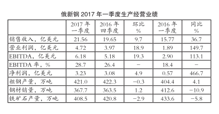 一季度,俄新钢虽然通过提高生产效率降低生产成本,但炼钢原料成本上涨使其板坯现金成本进一步环比增长15%至264美元/吨。受益于产品品种增加、销量增长及销售价格上涨,俄新钢一季度营业利润环比大幅增加18.9%至4.72亿美元,与2016年一季度相比营业利润更是骤增149.7%。一季度,俄新钢息税、折旧及摊销前利润(EBITDA)环比大幅增加19.3%至6.18亿美元,同比增幅高达113.1%,这主要得益于生产效率提高及投资收益增长;EBITDA率由2016年四季度的26.4%小幅增加至28.7%,且远高于2016年一季度的18.4%;净利润环比小幅增长4.9%至3.23亿美元,同比骤增466.7%。