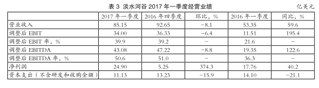 一季度,淡水河谷公司实现营业收入85.15亿美元,环比下滑8.1%,其原因在于黑色金属出现季节性销量下降,以及基本金属部门发生计划内停产维护和生产中断。一季度,淡水河谷公司成本和费用(扣除折旧)总计42.07亿美元,低于2016年四季度的46.21亿美元,其中,成本较上季度减少2.63亿美元,费用较上季度减少1.51亿美元。同期,淡水河谷公司调整后息税前利润(EBIT)环比减少6.4%至34.00亿美元,同比增幅却高达195.4%;调整后息税、折旧及摊销前利润(EBITDA)环比下滑8.8%至43.08亿美元,主要原因在于季节性销量减少,同比增幅却高达122.6%;净利润则环比骤增374.3%至24.90亿美元,这主要是由于淡水河谷向日本三井集团出售莫阿蒂泽煤矿和纳卡拉物流走廊部分权益获得7.70亿美元收益,2016年一季度净利润为17.76亿美元。