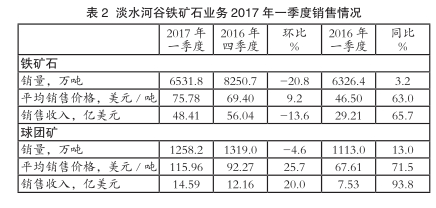 一季度,淡水河谷公司球团矿销量为1258万吨,环比减少4.6%,但同比大幅增长13.0%;球团矿平均销售价格由2016年四季度的92.27美元/吨显著上涨25.7%至115.96美元/吨,同比涨幅更是高达71.5%;从而使其球团矿销售收入环比显著增长20.0%至14.59亿美元,同比激增93.8%。