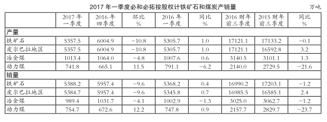 根据前三财季铁矿石产销量情况,必和必拓将2016财年铁矿石权益矿产量目标修订为2.31亿-2.34亿吨,按100%股权计的铁矿石产量目标修订为2.68亿-2.72亿吨。