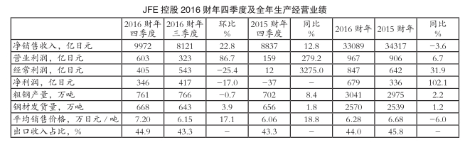 从2016财年来看,JFE控股公司粗钢产量同比小幅增长2.2%至3041万吨,钢材发货量同比小幅增加1.2%至2570万吨;钢材平均销售价格同比下跌6.0%至6.28万日元/吨;出口收入占净销售收入的比重由2015财年的45.8%下降至44.0%。