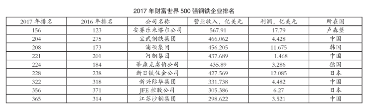 2017年,全球最大的钢铁企业安赛乐米塔尔公司以营业收入567.91亿美元排名世界500强第156位,虽然较上年排名显著下滑33位,但仍然是所有入围财富世界500强钢铁企业中排名最高的,并且同比实现扭亏为盈,是所有入围钢铁企业中盈利最高的;宝钢集团与武钢集团合并之后的中国宝武钢铁集团排名大幅攀升,从上年的第275位上升至第204位,营业收入达到466.062亿美元,也超越浦项成为入围世界500强钢铁企业第二位,同时是中国排名最高的钢铁企业;韩国浦项集团营业收入为456.205亿美元,排名第208位,排名较上年进一步下滑35位;河钢集团则以营业收入437.689亿美元排名第221位,较上年排名下降20位,但仍超越蒂森克虏伯公司成为入围世界500强钢铁企业第四位;德国蒂森克虏伯公司排名第224位,营业收入为435.89亿美元,较上年排名下降40位;日本新日铁住金公司排名第228位,排名较上年上升十位,营业收入为427.569亿美元;新兴际华集团以营业收入331.738亿美元排名第322位,排名较上年下滑四位;日本JFE控股公司排名出现止跌回升,由上年的第371位攀升至356位,营业收入为305.386亿美元;江苏沙钢集团排名第365位,较上年下降51位,营业收入为298.622亿美元,在入围钢铁企业中下滑幅度最大。