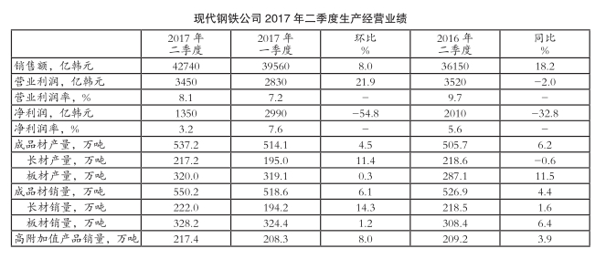 韩国现代钢铁公司近日公布的2017年二季度财报显示,尽管汽车、造船等下游行业持续低迷,但受益于钢材价格上涨,建筑施工行业助推长材销售增长,以及继续扩大高附加值战略产品销售,该公司钢材产量和销量实现环比和同比双双增长。此外,现代钢铁公司通过节省炼钢原料采购费用,降低物流费用,成功降本1360亿韩元,从而使二季度销售收入和营业利润环比增长,取得不俗的经营业绩。
