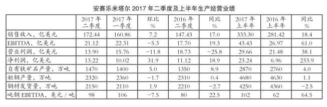 安赛乐米塔尔公司2017年二季度业绩报告显示,受国际市场钢材需求回升拉动,其粗钢产量虽环比小幅下滑,但钢材发货量环比增长。受益于钢材发货量增长和平均销售价格上扬,以及铁矿石发货量增加(尽管售价环比下滑),安赛乐米塔尔二季度销售收入环比和同比分别上涨7.2%和17.0%至172.44亿美元;息税、折旧及摊销前利润(EBITDA)环比下滑5.3%至21.12亿美元,同比却大幅增长19.3%;营业利润环比和同比分别减少11.8%和25.8%至13.90亿美元;净利润则环比和同比分别显著增长31.9%和18.9%至13.22亿美元。
