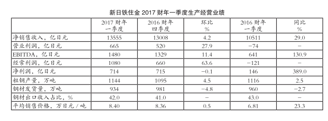 受益于钢材平均销售价格大幅上涨抵消了发货量下滑带来的负面影响,第一财季新日铁住金公司净销售收入为13555亿日元,环比小幅增长4.2%,同比显著增长29.0%;营业利润为665亿日元,环比显著增长27.9%,2016财年一季度营业利润亏损74亿日元;息税、折旧及摊销前利润(EBITDA)为1480亿日元,环比大幅增长11.4%,同比激增130.9%;经常利润为1080亿日元,环比激增63.6%,2016财年一季度经常利润亏损121亿日元;净利润为714亿日元,环比微降0.1%,但同比骤增389.0%。