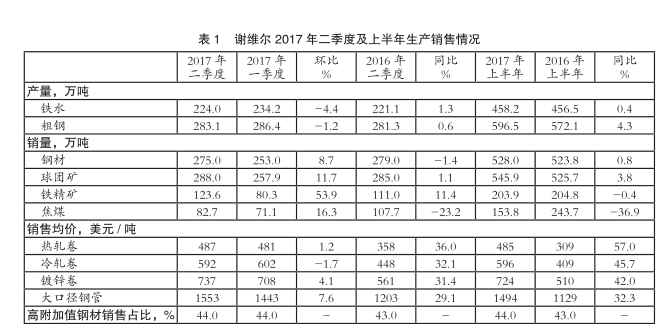 从2017年上半年来看,谢维尔铁水产量为458万吨,同比微增0.4%;粗钢产量为597万吨,同比小幅增长4.3%。