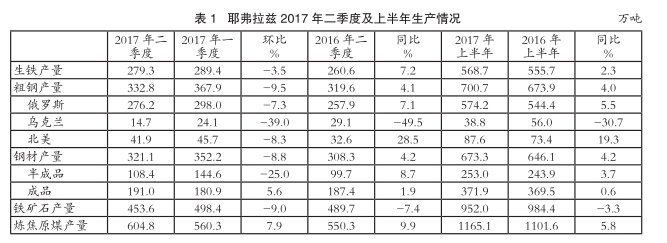 2017年二季度,俄罗斯耶弗拉兹集团(Evraz)生铁产量环比小幅下滑3.5%至279万吨,但同比增长7.2%;受旗下西西伯利亚钢厂(ZSMK)2号高炉、5号转炉和乌克兰DMZ钢厂转炉车间、1号轧制生产线在二季度按计划停产检修,以及北美分公司粗钢减产影响,耶弗拉兹二季度粗钢产量环比减少9.5%至333万吨,同比仍小幅增长4.1%。受半成品钢材产量显著下滑影响,耶弗拉兹二季度钢材产量环比减产8.8%至321万吨,但同比仍小幅增长4.2%。其中,半成品钢材产量为108万吨,环比显著减产25.0%,但同比仍增长8.7%,占钢材产量的比重由一季度的44.4%下滑至36.2%;成品钢材产量环比和同比分别小幅增长5.6%和1.9%至191万吨,占钢材产量的比重由一季度的55.6%增加至63.8%。