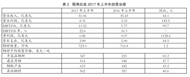 耶弗拉兹集团首席执行官Al exander Frol ov表示,2017年上半年受益于国际市场钢材价格上涨,炼钢原料价格高位运行,以及下属生产企业提高生产效率和降低生产成本,集团经营业绩显著提升,EBITDA实现同比翻番。同时,耶弗拉兹积极降低债务水平,2017年上半年末净债务总额由2016年上半年末的48.02亿美元降至42.84亿美元,自由现金流为7.46亿美元,财务稳健性进一步增强。