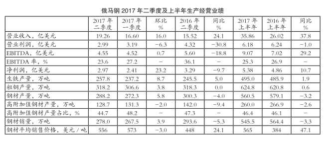 二季度,俄马钢钢材销量环比增长,钢材平均销售价格由一季度的573美元/吨小幅下跌3.0%至566美元/吨,但同比仍显著上涨24.1%,因此俄马钢营业收入环比和同比分别大幅增长16.0%和24.1%至19.26亿美元;受炼钢原料(特别是焦煤)价格上涨引发的销售成本增加影响,营业利润环比和同比分别下滑6.3%和30.8%至2.99亿美元;息税、折旧及摊销前利润(EBITDA)为4.55亿美元,环比微增0.7%,同比则大幅下滑18.8%;EBITDA率由一季度的27.2%环比下降3.6个百分点至23.6%,且显著低于2016年二季度的36.1%。二季度,俄马钢净利润由一季度的2.41亿美元环比显著增长23.2%至2.97亿美元,同比仍下滑9.7%。