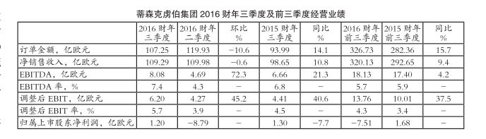 2016财年前三季度,蒂森克虏伯集团订单金额同比大幅增长15.7%至326.73亿欧元,创执行“Strategic Way Forward”战略以来的最好水平;净销售收入同比增长9.4%至320.13亿欧元;EBITDA同比小幅增长4.2%至18.13亿欧元;EBITDA率由2015财年前三季度的5.9%小幅下滑至5.7%;调整后EBIT同比显著增长37.5%至13.76亿欧元;调整后EBIT率由2015财年前三季度的10.1%提升至13.76%;归属上市公司股东净利润由2015财年前三季度的盈利1.68亿欧元转为亏损7.51亿欧元,这也是受二季度出售巴西CSA板坯厂拖累。