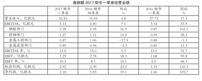 2016财年四季度的31.93亿欧元相比小幅增长1.8%,同比增幅高达17.3%;息税、折旧及摊销前利润(EBITDA)环比增长7.1%,同比显著增长53.9%至5.14亿欧元,创2009年金融危机以来的季度新高,这主要是受到钢材需求增长和价格上涨推动;EBITDA率由2016财年四季度的15.0%提高至15.8%,且高于2016财年一季度的12.0%;息税前利润(EBIT)为3.29亿欧元,环比和同比分别大幅增长18.3%和95.8%;EBIT率由2016财年四季度的8.7%进一步增加至10.1%,且高于2016财年一季度的6.0%;税前利润为2.92亿欧元,环比和同比分别显著增长22.2%和110.1%;净利润为2.18亿欧元,环比和同比分别显著增长19.1%和105.7%。