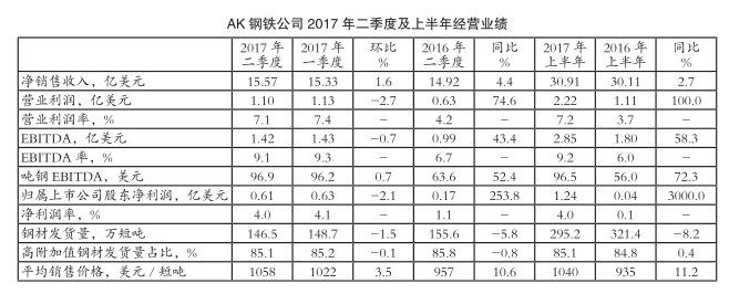 2017年二季度,美国钢材市场进入需求旺季,钢材价格进一步上涨。受此利好因素推动,AK钢铁公司二季度钢材发货量虽小幅下滑,但平均销售价格环比和同比双双增长。同期,面对炼钢原料和能源成本增加的不利局面,AK钢铁持续提升生产效率以降低生产成本,并通过开发新产品以及增加高附加值钢材销量等手段,实现净利润同比激增。