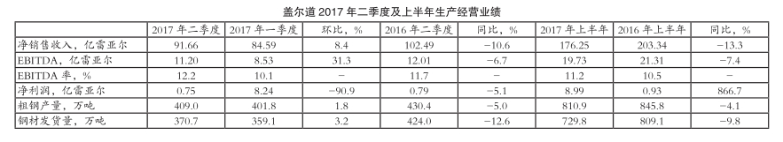 2017年二季度,北半球钢材市场需求季节性回升,北美和欧洲市场钢材需求增长,与此同时新兴市场国家经济增速加快。处于南半球的巴西进入冬季需求淡季,建筑业钢材需求减少引发长材销量下滑,但该国新政府上台之后采取包括连续降息等一系列措施最终使得该国经济结束连续十二个季度的下滑并出现回升,同时受国际市场钢材价格上涨拉动,该国市场钢材价格小幅回升。受上述因素以及旗下巴西部门增加钢材出口量和特殊钢部门销量增长影响,二季度盖尔道集团粗钢产量和钢材发货量均实现环比增长,但同比仍双双下滑(这主要是受出售西班牙特钢企业影响),加之钢材销售均价环比上涨,其净销售收入和息税、折旧及摊销前利润(EBITDA)环比大幅增长,净利润则受汇率变化影响环比缩水逾九成。