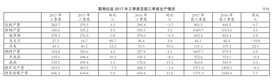 三季度,耶弗拉兹生铁平均销售价格由二季度的251美元/吨上涨至282美元/吨,半成品钢材平均销售价格由二季度的352美元/吨上涨至364美元/吨,建筑用钢平均销售价格由二季度的499美元/吨大幅上涨至543美元/吨,钢轨平均销售价格由二季度的646美元/吨小幅上扬至648美元/吨。从前三季度来看,受益于国际市场钢材价格持续复苏,耶弗拉兹所有钢铁产品平均销售价格均同比显著上涨,其中生铁平均销售价格由2016年前三季度的160美元/吨大幅回升至260美元/吨,半成品钢材平均销售价格由2016年前三季度的240美元/吨显著上涨至353美元/吨,建筑用钢平均销售价格由2016年前三季度的373美元/吨大幅跳涨至524美元/吨,钢轨平均销售价格由2016年前三季度的467美元/吨激增至637美元/吨。