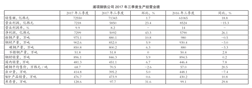 韩国浦项近期公布的2017年三季度财报显示,其三季度粗钢产量和钢材产量均环比增长,且钢材销量同环比双双增长。受碳钢平均销售价格由2016年三季度的57.0万韩元/吨同比显著上涨20.5%至68.7万韩元/吨影响,浦项钢铁销售额同比大幅增长18.8%至7.25万亿韩元;尽管浦项钢铁努力增加高附加值WP(Worl d Premium)产品销量,并采取措施持续降本增效,但受炼钢原料成本增加影响,其营业利润同比大幅下滑15.3%至7218亿韩元;营业利润率从二季度的8.2%增加1.7个百分点至9.9%,但低于2016年三季度的14.0%;净利润为7299亿韩元,同比显著增长26.1%;负债率为16.3%,财务稳健性持续改善。