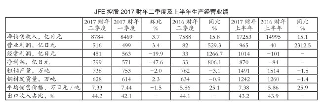 受以上因素共同影响,2017财年二季度(2017年三季度)JFE控股公司粗钢产量和钢材发货量虽然同比小幅下滑,但受益于钢材平均销售价格同比显著上涨,其第二财季净销售收入同比大幅提升,营业利润、经常利润和净利润均实现同比激增。