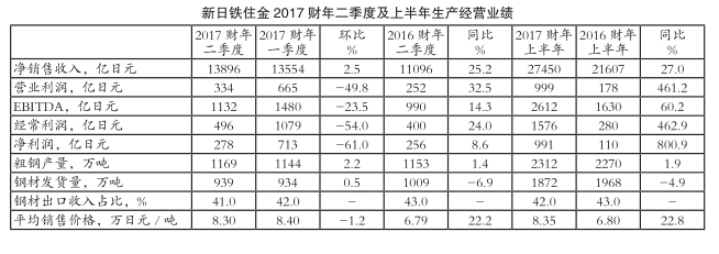 受益于钢材平均销售价格同比大幅上涨抵消了发货量同比下滑带来的负面影响,第二财季新日铁住金公司净销售收入为1.39万亿日元,环比小幅增长2.5%,同比显著增长25.2%;营业利润为334亿日元,环比显著减少49.8%,但同比显著增长32.5%;息税、折旧及摊销前利润(EBITDA)为1132亿日元,环比显著下滑23.5%,但同比大幅增加14.3%;经常利润为496亿日元,环比显著缩水54.0%,但同比显著增长24.0%;净利润为278亿日元,环比显著减少61.0%,但同比增加8.6%。