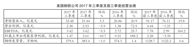 美国钢铁公司首席执行官Dave Burritt表示,2017年三季度美国钢材市场进入传统需求旺季,尽管钢材发货量环比小幅下滑,但钢材平均销售价格上涨使公司三季度经营业绩好于预期,尤其是钢管部门EBITDA实现环比扭亏为盈。与此同时,轧制扁平材部门和钢管部门营业收入均实现环比增长。从前三季度来看,美国钢铁公司下属三大业务部门经营业绩均实现同比增长,从而进一步强化了公司的资产负债表。此外,美国钢铁公司三季度净债务规模进一步减少2亿美元至12亿美元,同时流动资产总额进一步增加,这些有助于公司继续执行“资产振兴战略(Asset Revital ization Program)”。未来,美国钢铁公司将继续坚持这一核心战略,并为客户开发和生产第三代先进高强度汽车用钢产品。